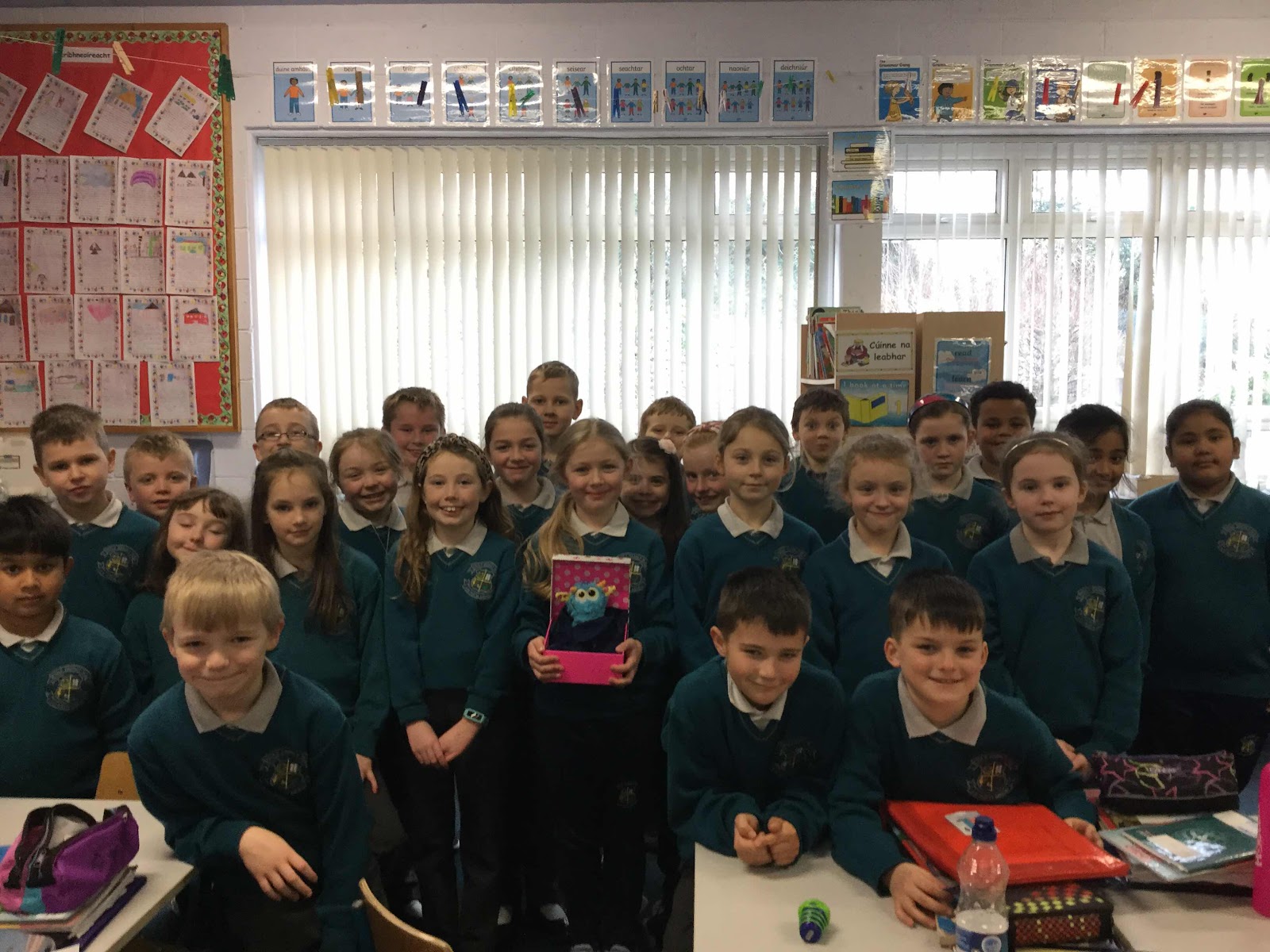 Séimí-our teddy who helps us with our Gaeilge-was delighted with his new ‘leaba’ that one of the girls brought in. Tá áthas an domhain air!